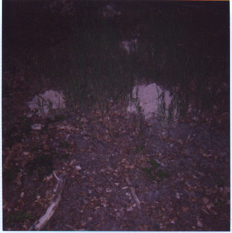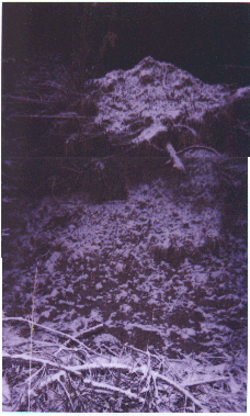 Man sieht einen 2m hohen sehr schmalen Windwurfhügel (Buche), darunter kommt ein erschreckend toter Boden zum Vorschein, bestehend aus runden Steinen und einem feinsandähnlichen Boden. Dort wächst kein Chlorophyll und keine Wurzel.
