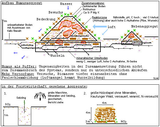 Bodenverbesserungen im Wald beschränken sich auf Forstarbeit (Mischwald und Kalk/Basalt-Schotter auf Wegen), flächendeckende Kalkungen (aber nur bis pH 3,8 , Link bei Hessen-Forst.de) und manchmal findet man einen leeren Sack KP. Ich versuche punktuelle Bodenverbesserungen mit Erdkomposten. Dabei werden soviele Mineralien gegeben wie ohne Nährstoffverlust vertragen wird (Boden-neuaufbau, Wurzeln, Humus, Puffer, Seiteneffekte). Diese "gartenbauähnlichen" Maßnahmen mit Erfahrung und individuellen Aggregaten sollen natürlich mit maschineller Unterstützung ausgeweitet werden. Ein Negativbeispiel sind die 4-oder 6Beiner, die vor Jahren im Osten gescheitert sind (auf SO2-toten Hügeln Mineralien 1m in Boden gemischt von Großmaschine, dann Setzling rein). Dabei wurden überhaupt nicht die Faktoren beachtet: Luft, Wasser, Nährstoffe. Entweder der pH-Wert wird erhöht, dann werden zuviele Nährstoffe frei für die Bodensituation, oder es wird zu wenig gegeben, der pH-Wert bleibt zu niedrig. Auf eine solche Bodenkunde verzichte ich. Stattdessen führe ich ein Aggregat vor, dass nicht unter Luftmangel oder Wasser-, Nährstoff- und Protonen-Überschuss leidet. Bei meiner Bearbeitung stehen im Vordergrund die Anlage von Erdkomposten für die Wurzeln, maschinelle Teildurchführung, wissenschaftliche Begleituntersuchungen zu Nährstoffverlusten, volkswirtschaftlicher Nutzen, und nicht so sehr die gesamten chemischen Feinheiten. Wenn die Wurzeln ökologisch wachsen und nachgewiesenermaßen nichts verlorengeht, ist es gut genug. Entsprechend einem Begründer der Bodenkunde, Prof.Sekera `43: "Der Land- oder Forstwirt soll der Hausarzt seines Bodens sein", und nicht der Pathologe.