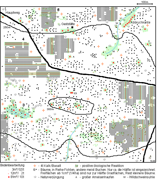6 älterer Buchenbestand mit Kalk/Basalt, Seilpflug und vielen kleinen Bearbeitungen. Untersuchungen wie oben (Boden, Wasser, Ökologie), Uni KS